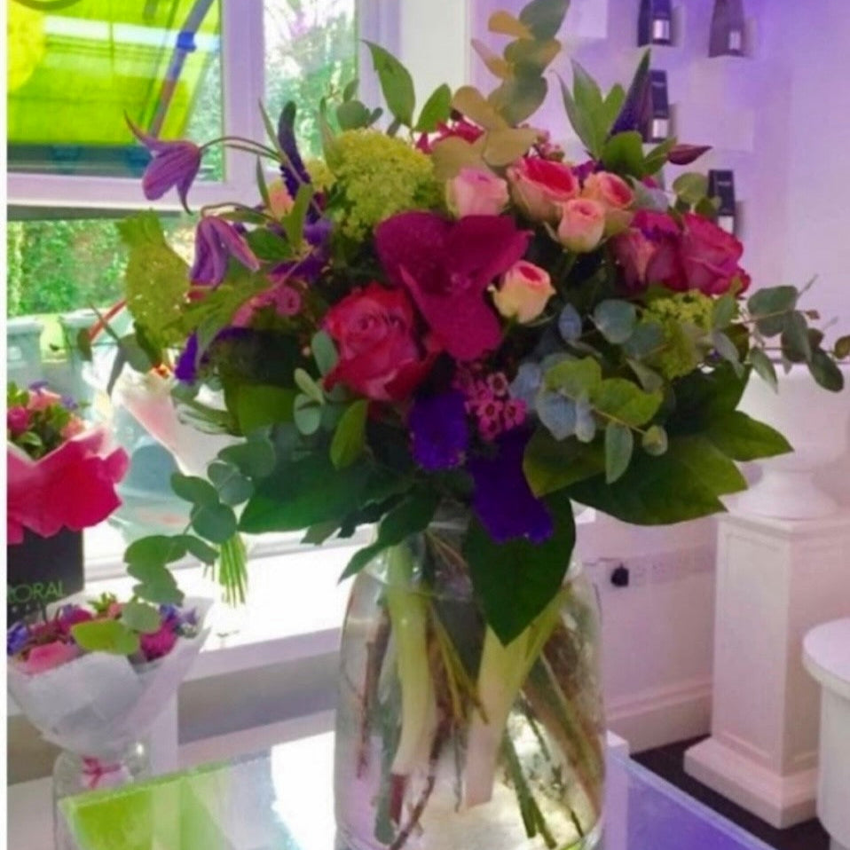 Elevate your Valentine’s Day with the sophisticated beauty of our 'Amour' arrangement — a dazzling alternative to traditional red roses. This glamorous vase arrangement features an opulent palette of rich jewel tones, including exotic hot pink Vanda Orchids, two-tone Mimi Eden Spray Roses, and fragrant Waxflower. Accented with fresh apple green Guelder Rose, delicate lavender Clematis, and finished with aromatic Eucalyptus, this design is as unique as it is breathtaking. Complete with a stylish vase, the 'Amour' design is a statement of elegance and timeless romance.