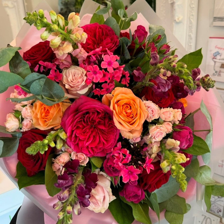 Indulge in the vibrant beauty of our 'Passion' bouquet, a striking arrangement that radiates romance and elegance. Featuring lush hot pink Garden Roses, delicate pastel pink Sweet Avalanche Roses, and charming two-tone peachy-pink Miss Piggy Roses, this design is a true feast for the senses. Accented with deep burgundy Snapdragons, pastel pink Spray Roses, premium Red Roses, vibrant hot pink Phlox, and the soothing aroma of fragrant Eucalyptus, this vase arrangement is perfect for expressing heartfelt passion and love.
