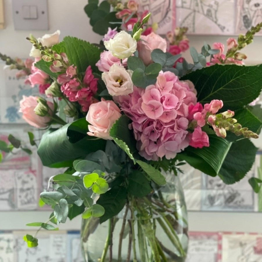 Delight in the timeless elegance of our 'Romance' arrangement — a modern vase arrangement featuring a stunning blend of soft and pastel pink blooms. This eye-catching design includes delicate pastel pink Sweet Avalanche Roses, billowing soft pink Hydrangeas, charming pink Snapdragons and Lisianthus, elegant Spray Roses, and fragrant Eucalyptus. Perfect for expressing love with grace and sophistication, this design comes complete with a stylish vase to complement its beauty.